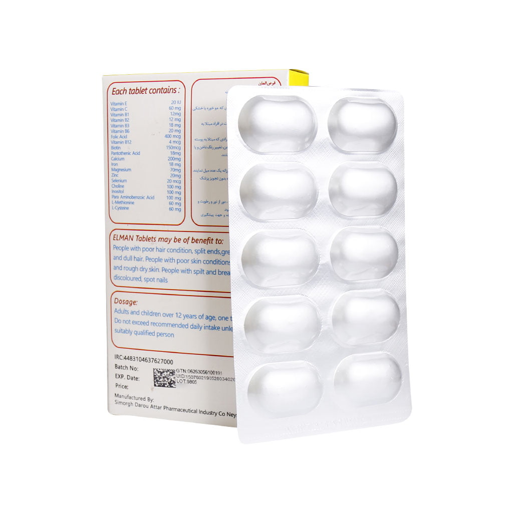 قرص المان سیمرغ دارو عطار شامل ویتامینهای گروه B، C، E، کلسیم، آهن، زینک، اینوزیتول، منیزیم، سلنیوم، کولین، پارا آمینو بنزوئیک اسید، ال متیونین و ال سیستئین است که برای سلامت بدن به خصوص تقویت پوست، مو و ناخن ضروری است. قرص المان، ریشه گیاهی دارد که بدون عوارض جانبی به رشد بهتر مو و ناخنها کمک میکند.